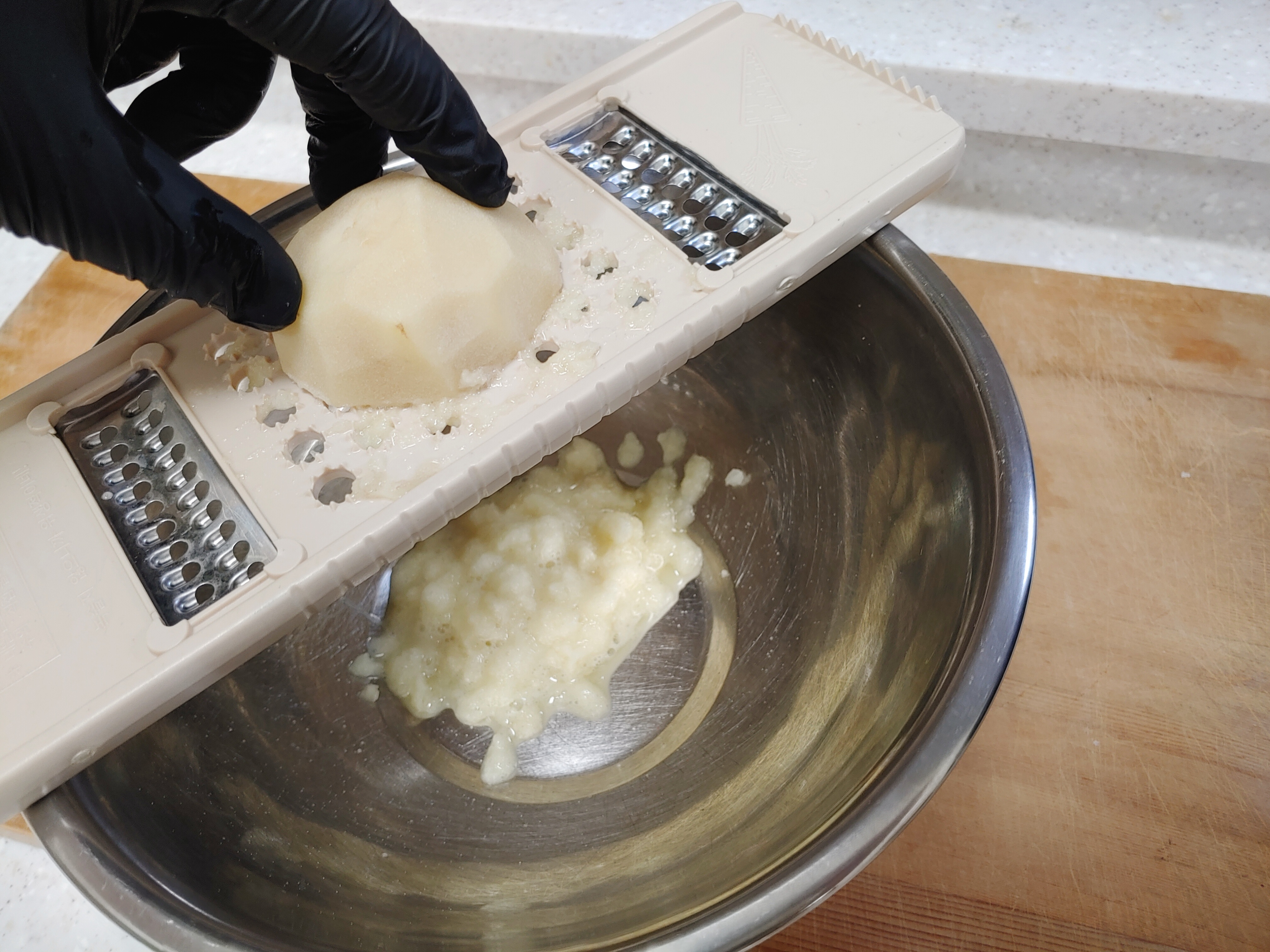 강판에 갈아낸 감자는 체에 밭쳐 건더기와 전분물을 분리해줍니다.