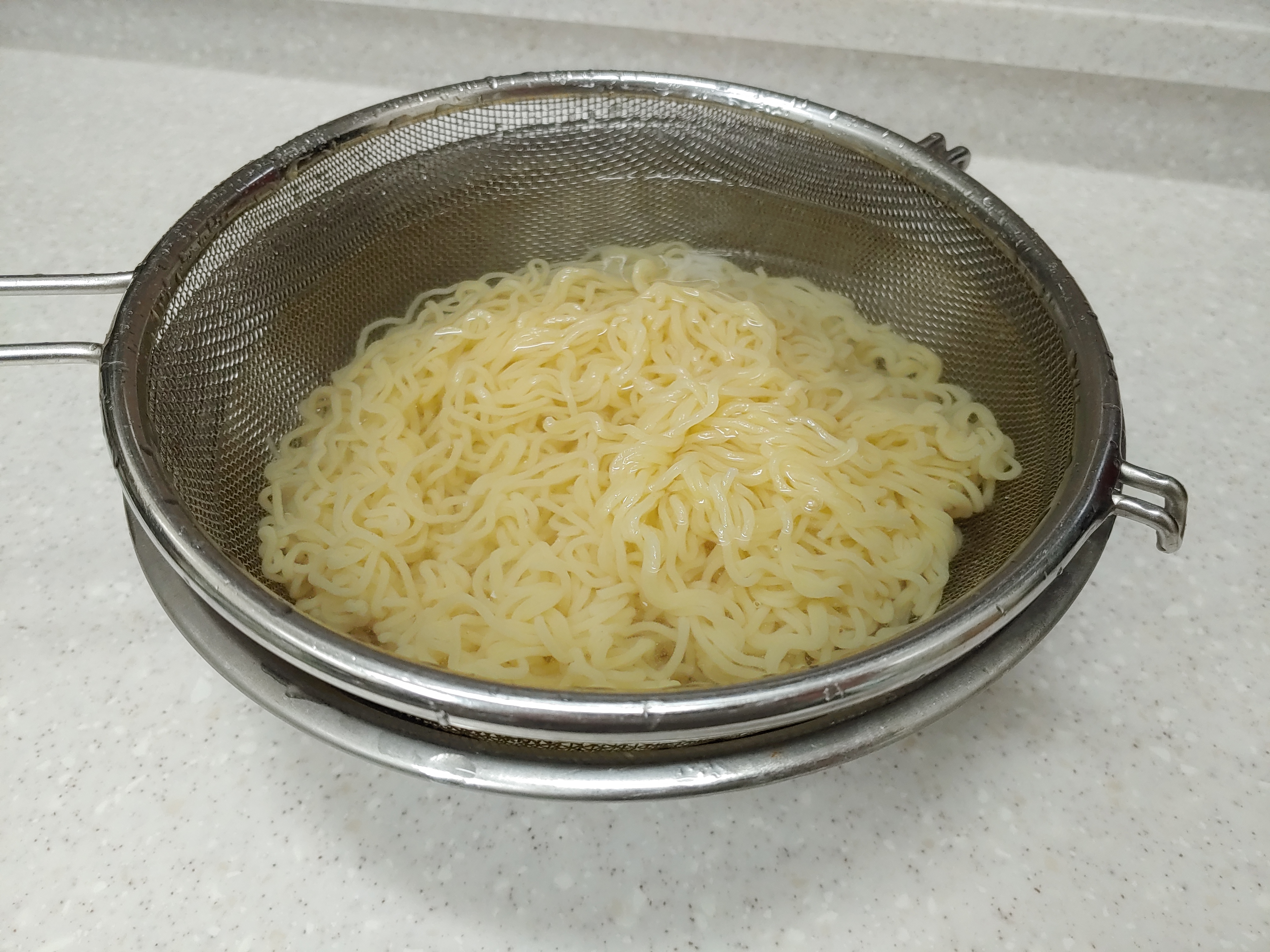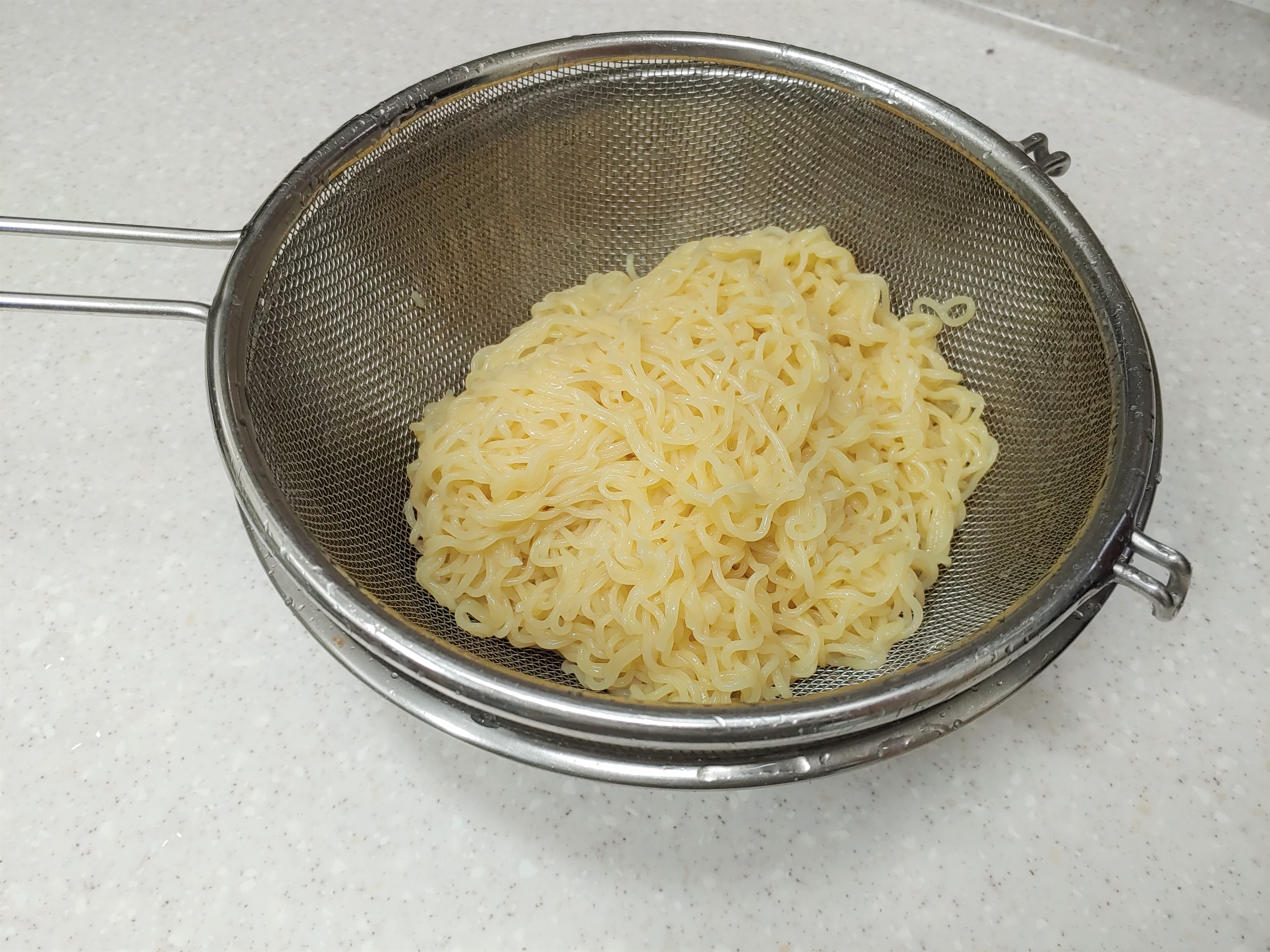 삶은 면은 바로 찬물에 담가 탱글탱글하게 헹궈줍니다.