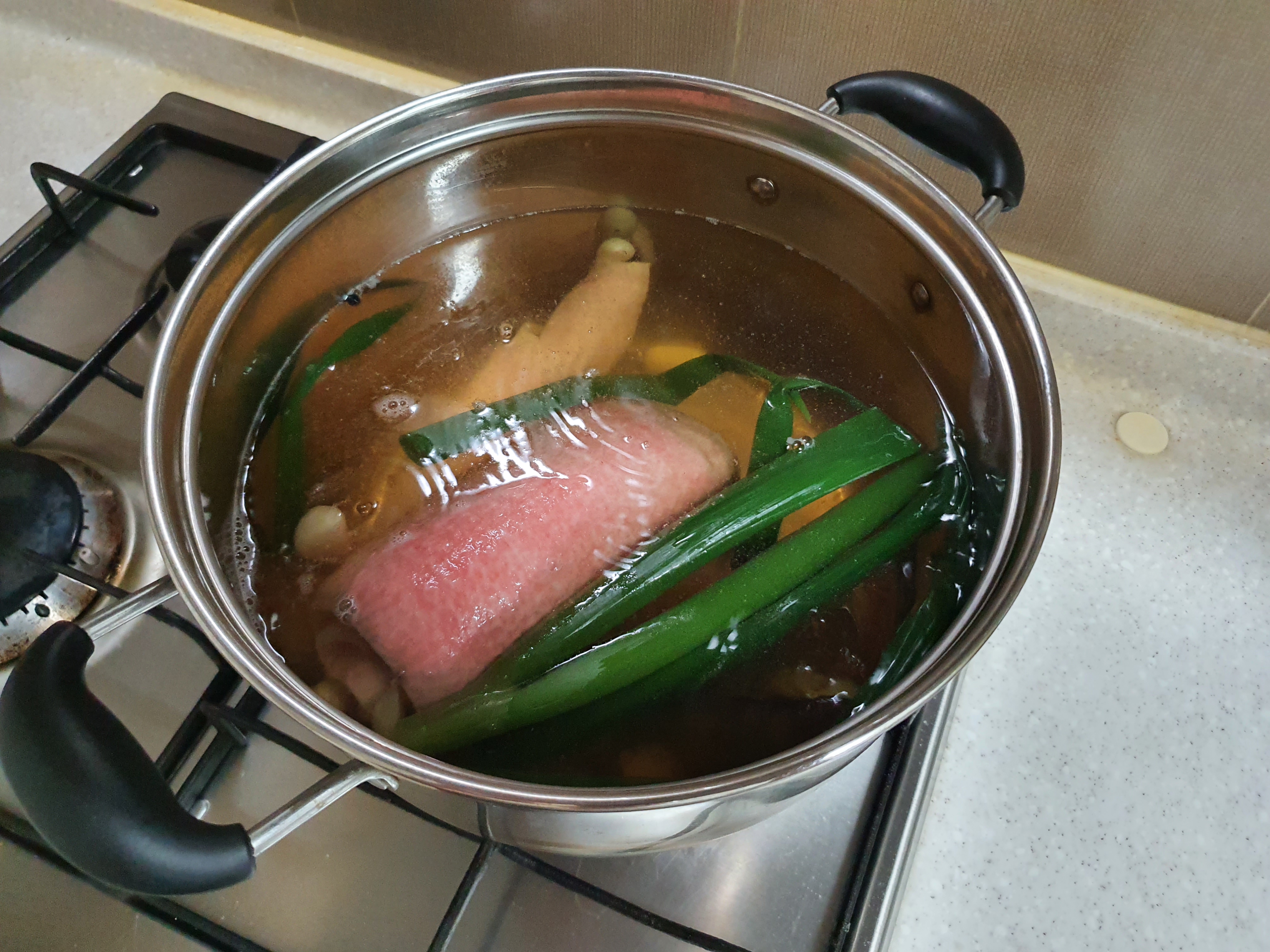 대파와 마늘, 생강, 월계수 잎, 통후추를 넣어 센 불로 끓여주세요.