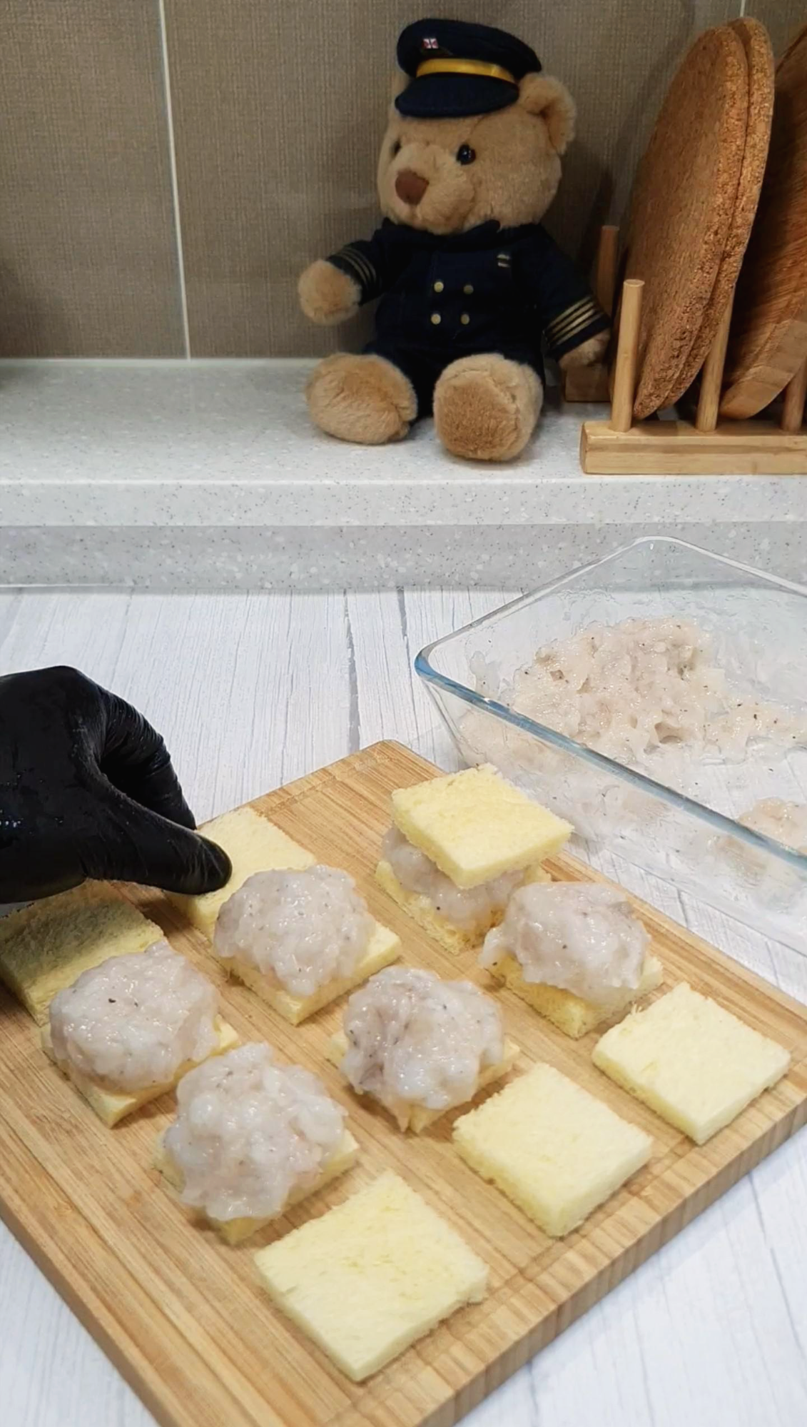 새우 반죽을 동그란 완자 모양으로 빚어 식빵 위에 얹어주세요