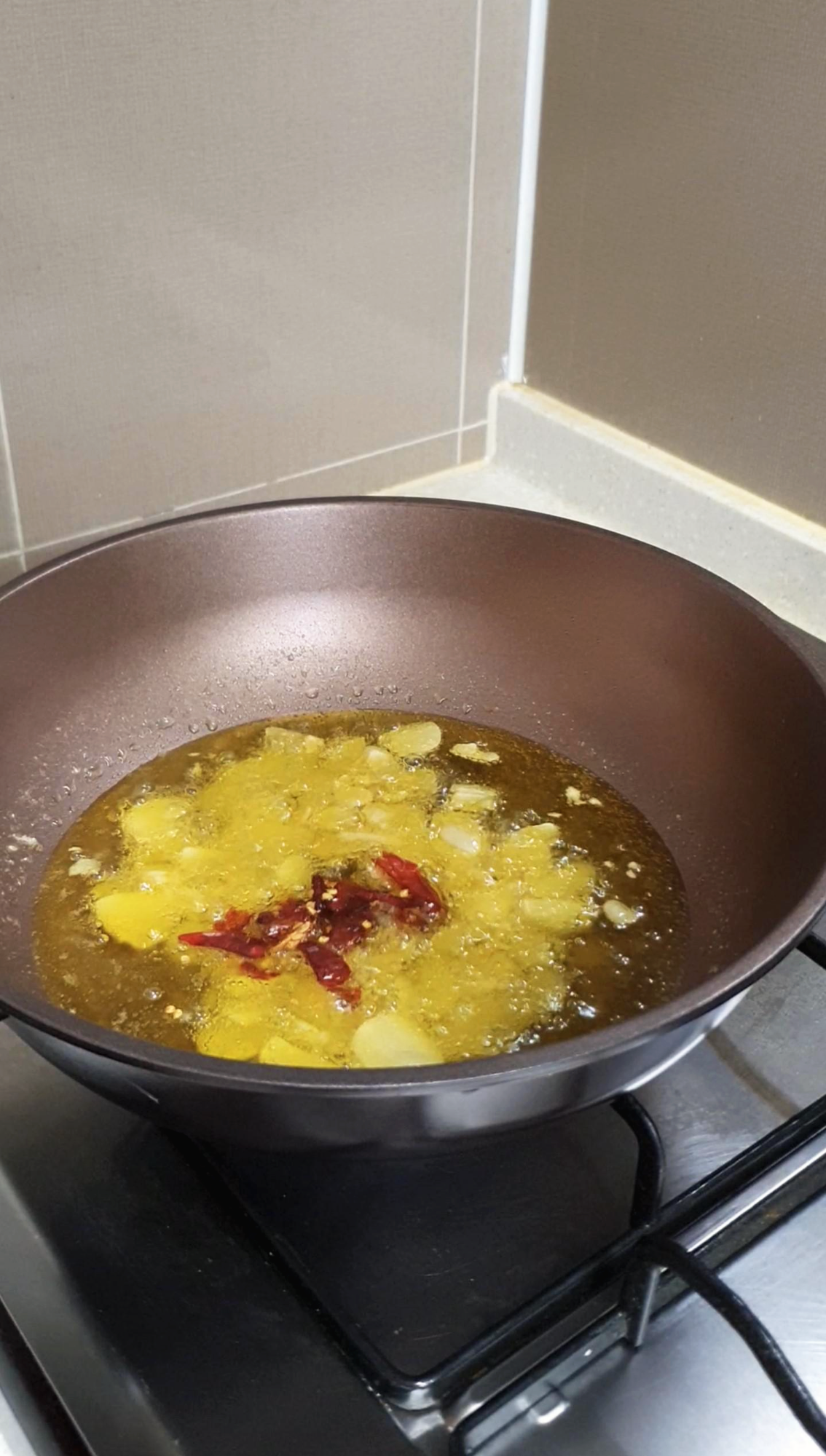 오일이 끓기 시작하면 페퍼론치노를 부셔서 넣어주세요