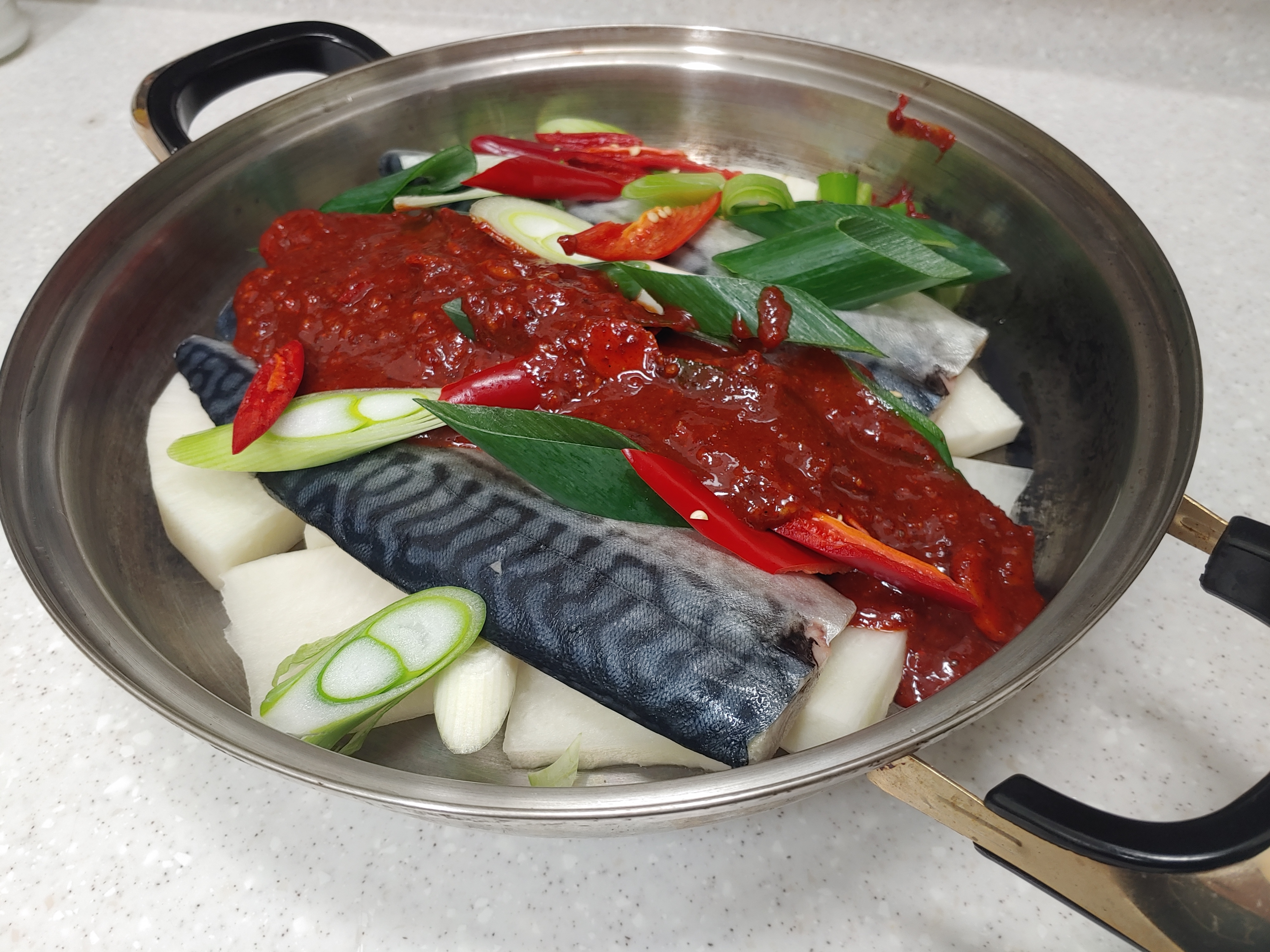 매콤 짭조름한 양념에 고등어와 무를 얹어먹으니