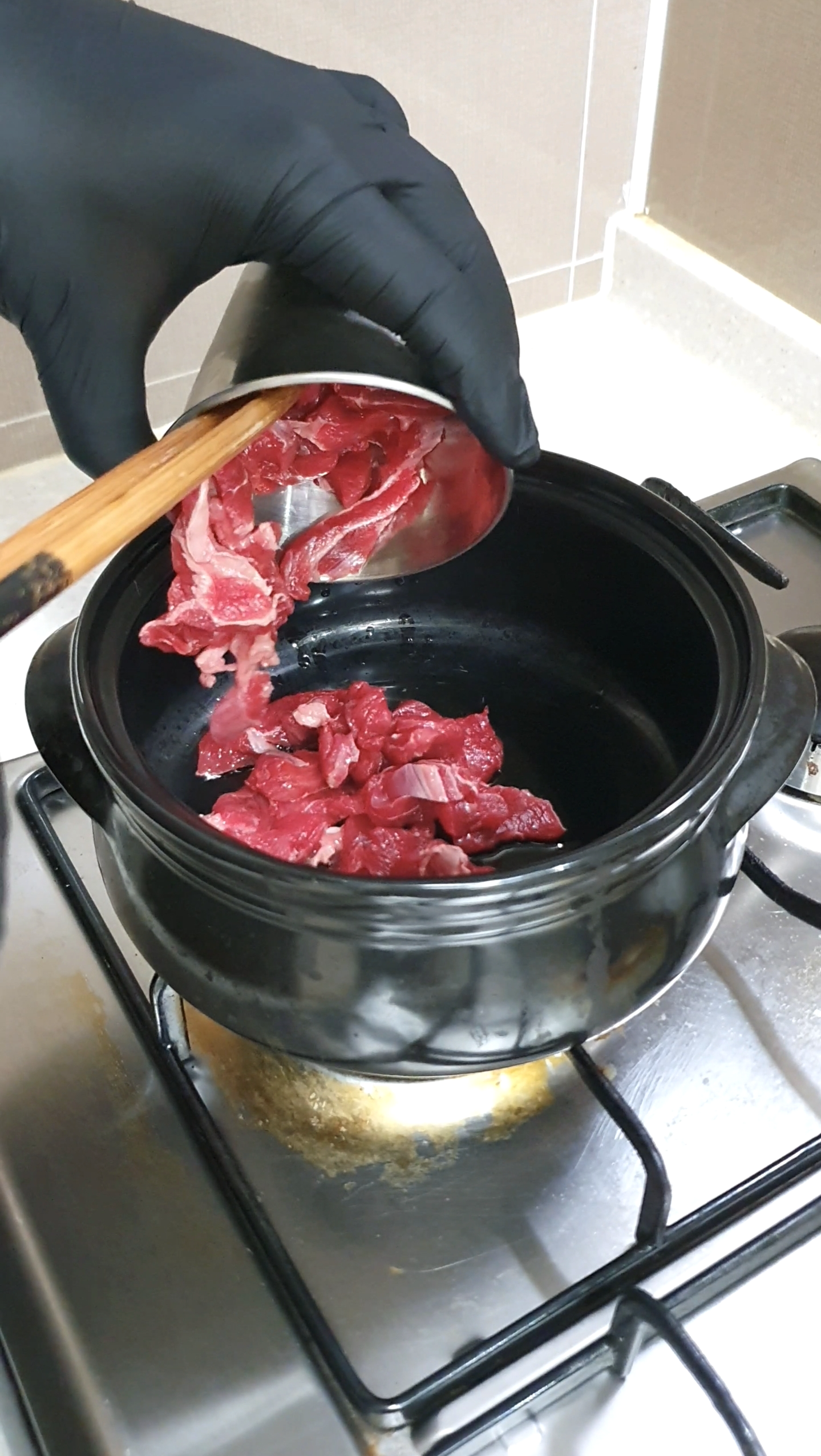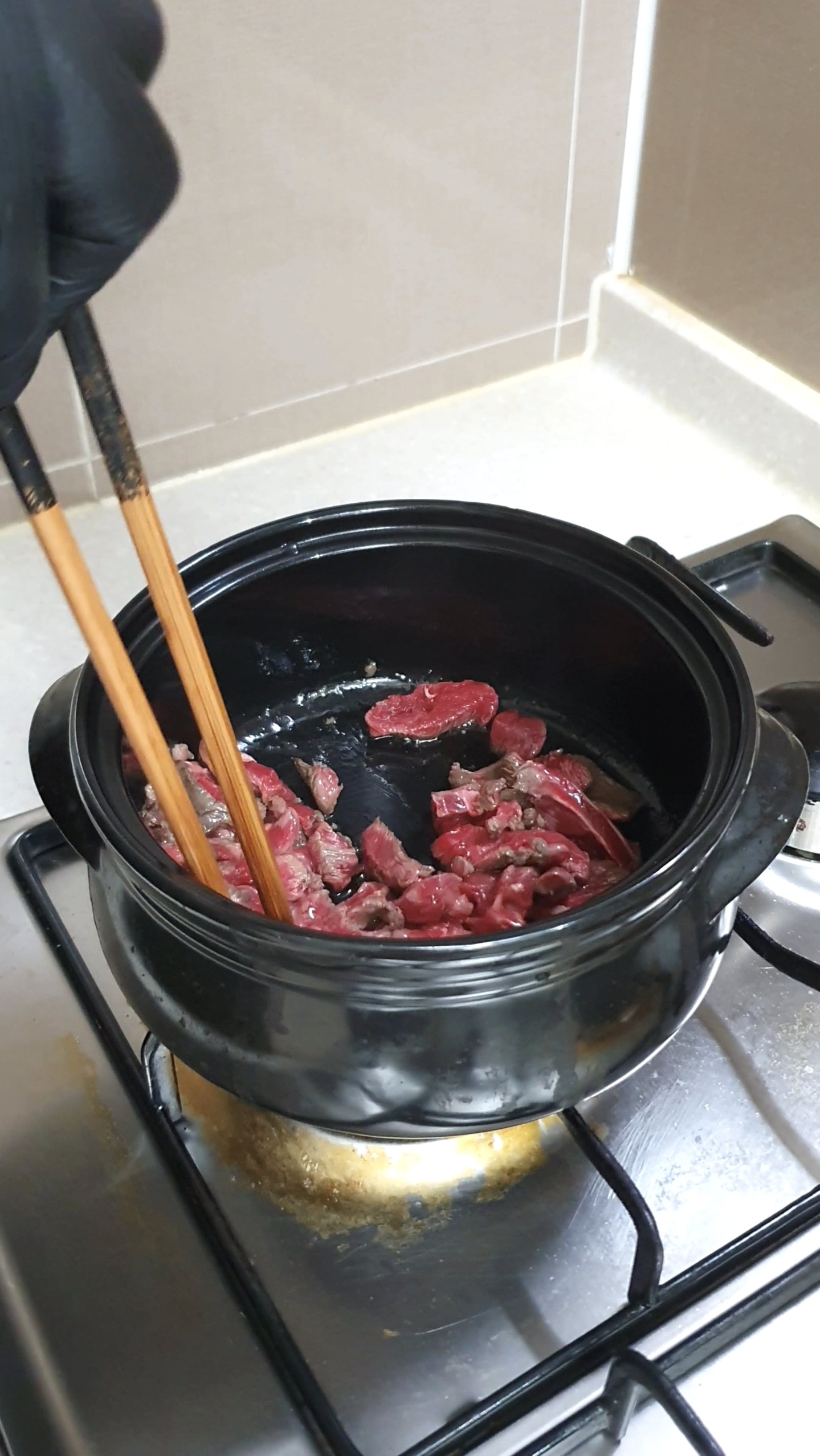 냄비에 참기름과 식용유를 두르고 소고기와 후추 한 꼬집을 넣고