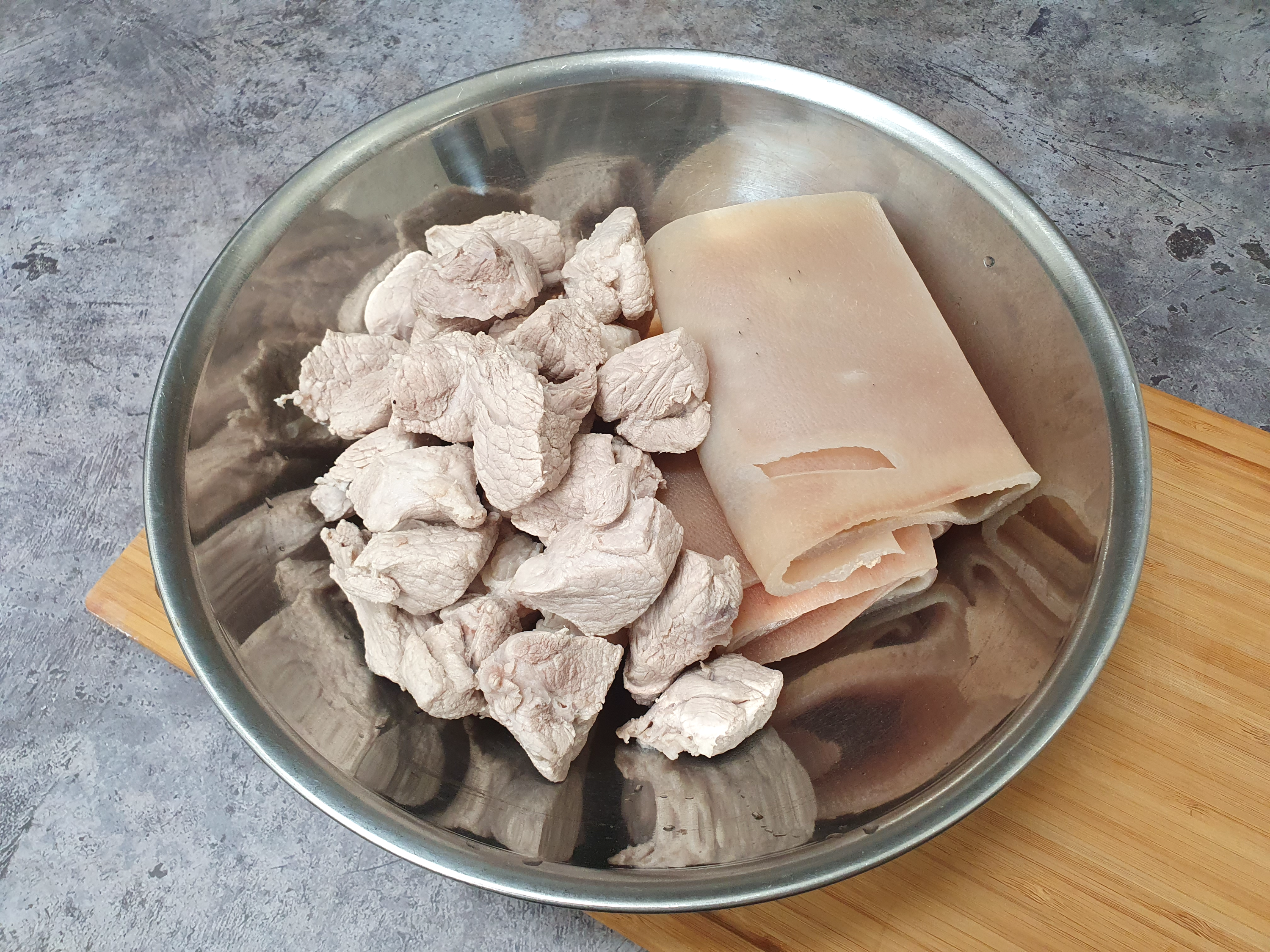 돼지고기는 작은 덩어리로 썰어주고, 껍데기는 0.5cm 두께로 잘라 준비해주세요